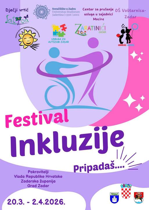 U Hrvatskom narodnom kazalištu u Zadru 20. ožujka svečano je otvoren 4. Festival inkluzije "Pripadaš". Festival su zajedno organizirali Odjel za zdravstvene studije Sveučilišta u Zadru, Dječji vrtić Latica, Osnovna škola Voštarnica - Zadar, Centar za pružanje usluga u zajednici [...]