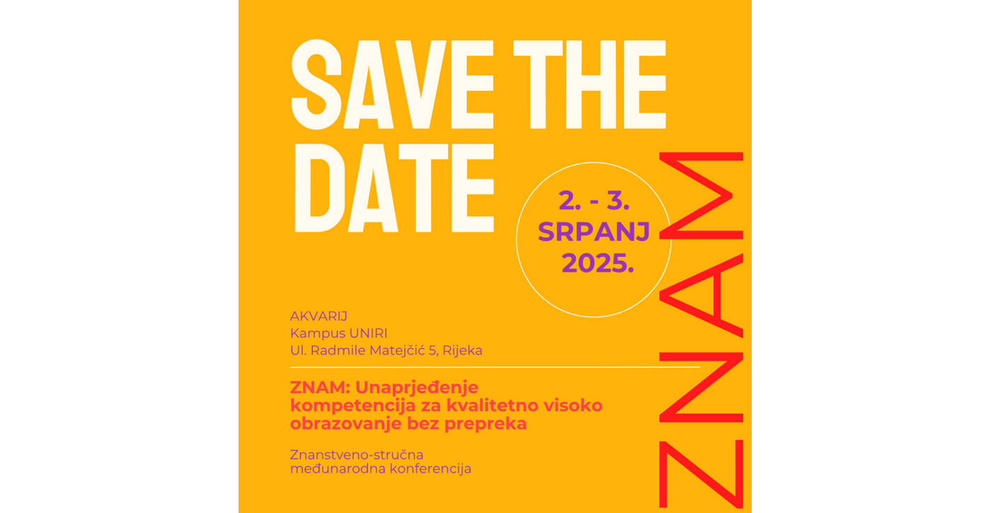 U organizaciji Udruge za mlade i studente s invaliditetom Primorsko-goranske županije “Znam” i Savjetovališta za akademsku prilagodbu Sveučilišnog savjetovališnog centra Sveučilišta u Rijeci te u suradnji s Koordinacijom pravobranitelja za osobe s invaliditetom za podršku u visokom obrazovanju i Mreže regionalnih centara/ureda za podršku studentima s invaliditetom održat će se Znanstveno-stručna međunarodna konferencija “Znam: Unaprjeđenje kompetencija za kvalitetno visoko obrazovanje bez prepreka” .