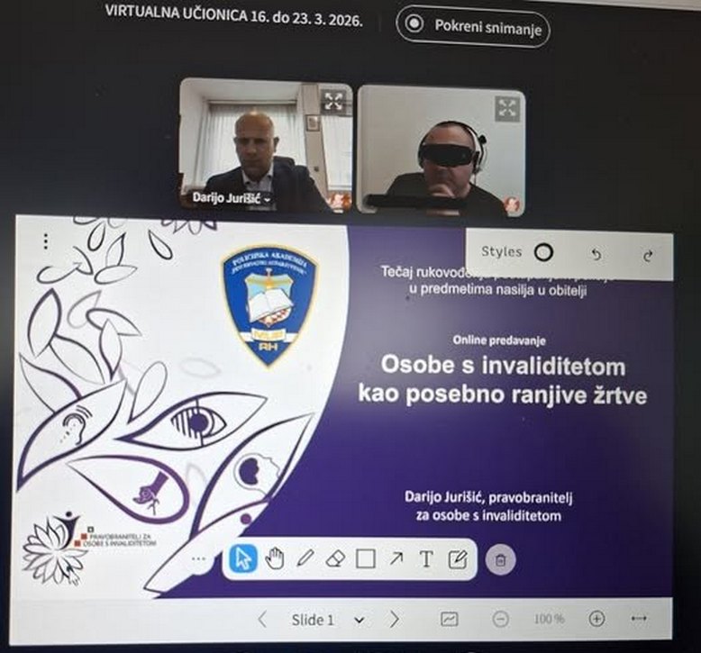 Pravobranitelj za osobe s invaliditetom Darijo Jurišić održao je 19. ožujka 2025. godine online predavanje na temu „Osobe s invaliditetom kao posebno ranjive žrtve“ u sklopu Tečaja rukovođenja postupanjem policije u predmetima nasilja u obitelji.